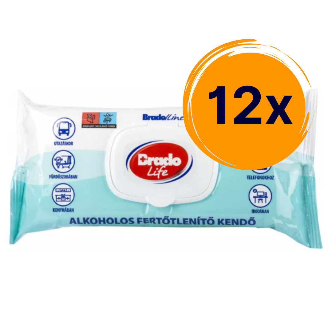12 csomag Bradolife alkoholos fertőtlenítő kendő kupakos kivitelben (64 db/csomag)