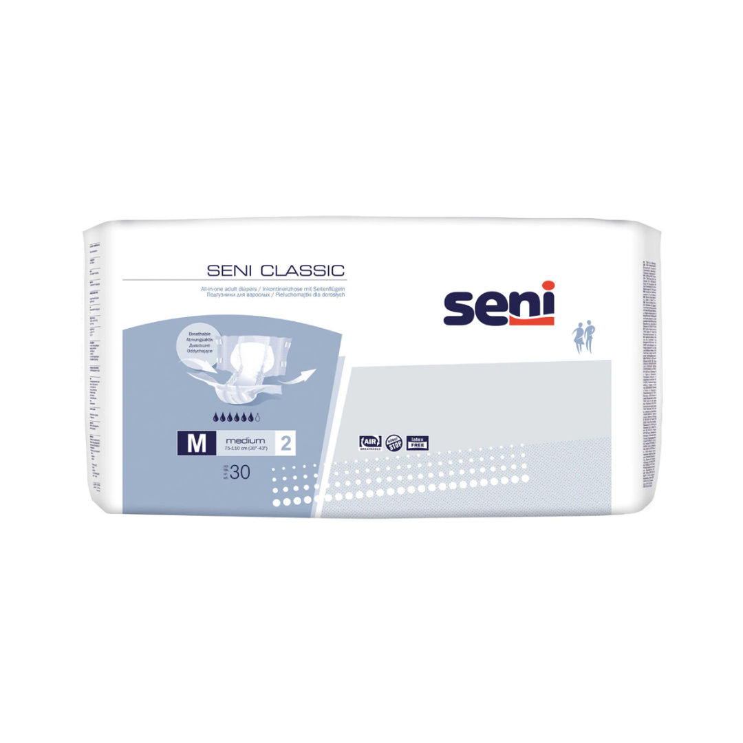 A Seni Classic nadrágpelenka kifejezetten középsúlyos és súlyos inkontinenciával küzdő felnőttek számára készült. A termék teljes felületén légáteresztő, így biztosítva a bőr szabad légzését és csökkentve a bőrirritáció kockázatát. A dupla nedvszívó mag gyors folyadék elvezetést tesz lehetővé, míg a szuperabszorbens összetevő minimalizálja a kellemetlen szagok kialakulását. A ragasztós tépőzár lehetővé teszi a pelenka többszöri nyitását és visszazárását a külső réteg megsérülése nélkül. Az oldalsó védőgátak megbízható védelmet nyújtanak az oldalirányú szivárgás ellen. A nedvesség indikátor jelzi a pelenka telítettségi fokát és a csere szükségességét.